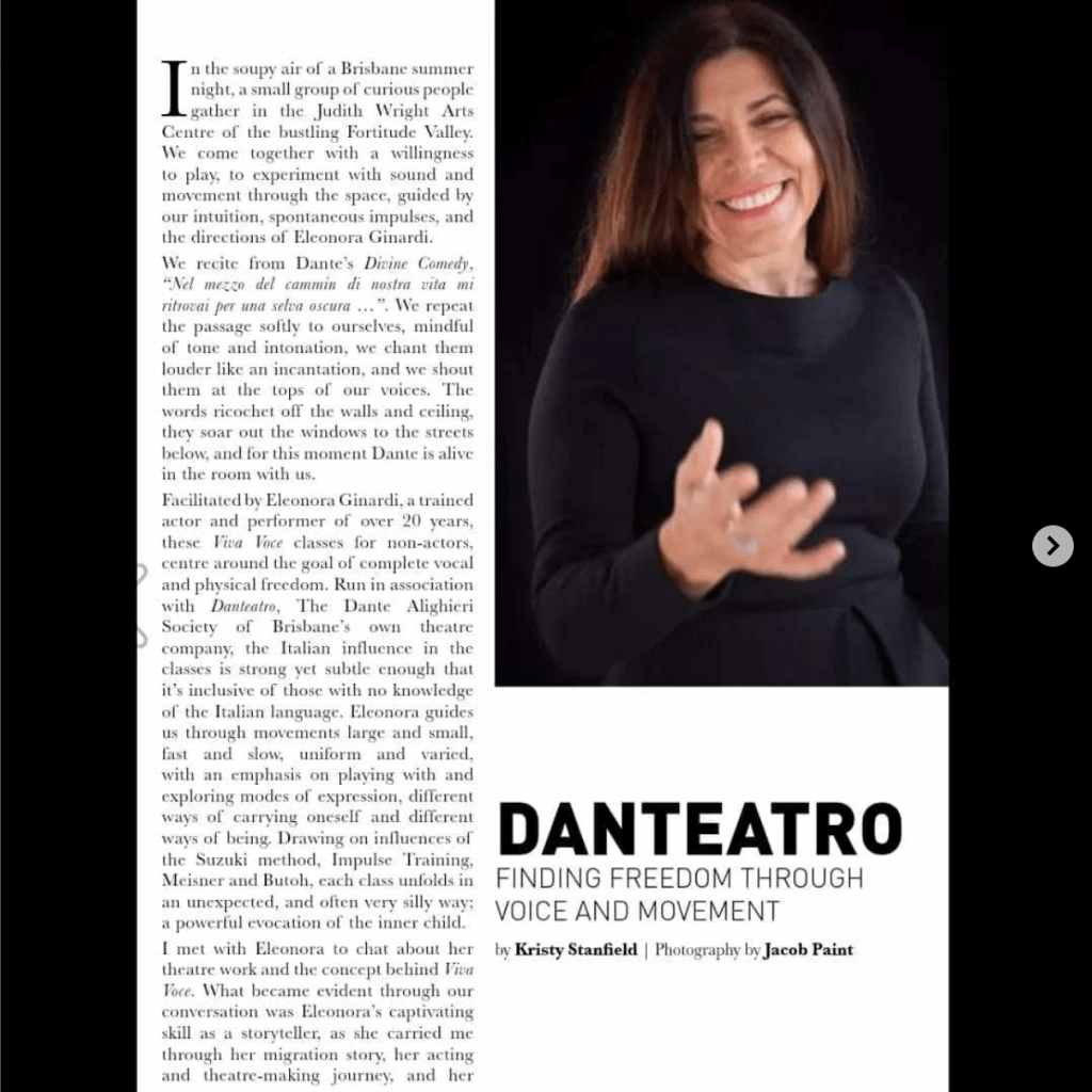 Danteatro’s artistic director, Eleonora Ginardi, was featured in issue 23 of the Segmento magazine, in an article by Kristy Stanfield.